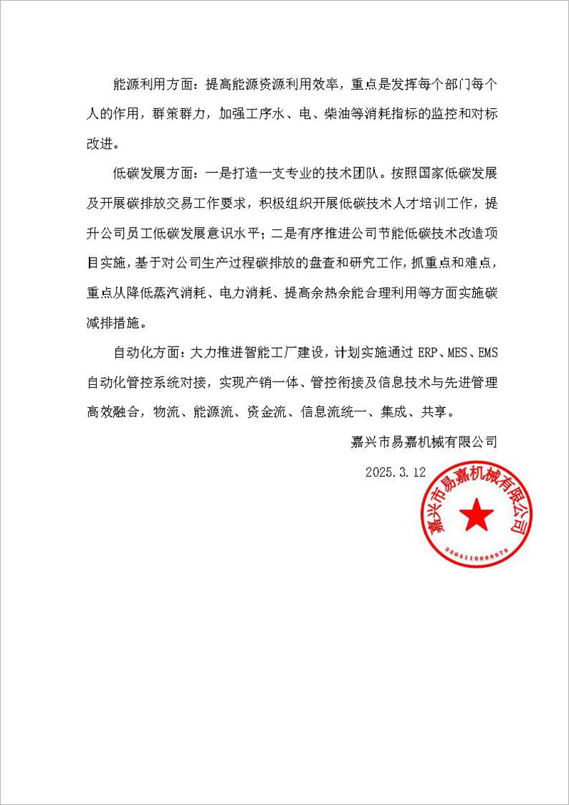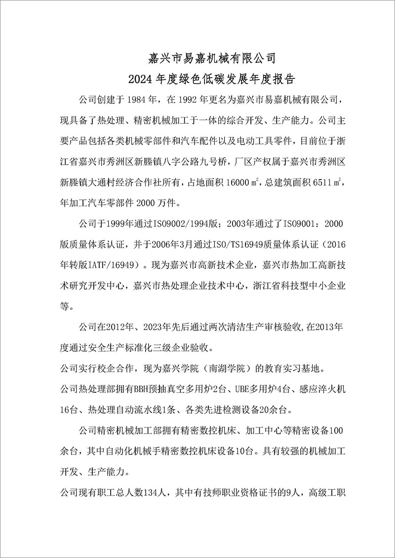嘉興市易嘉機(jī)械有限公司2024年度綠色低碳發(fā)展年度報(bào)告